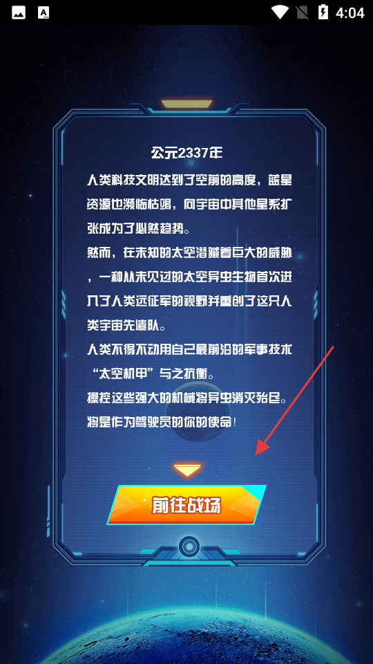 1、公元2337年背景下,點擊【前往戰場】,開啟駕駛太空機甲對抗異蟲的使命。