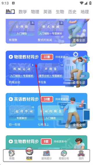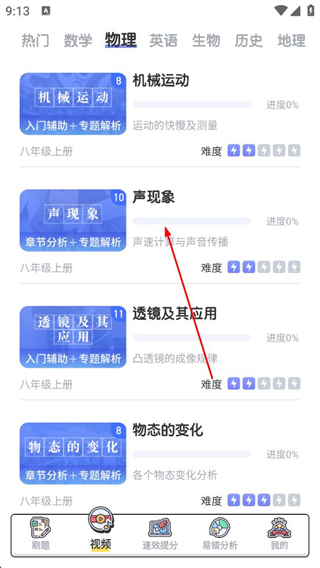 2、進入視頻頁面切換數學物理等學科分類,選擇物理教材同步板塊,查看機械運動聲現象等知識點條目,準備學習對應內容。