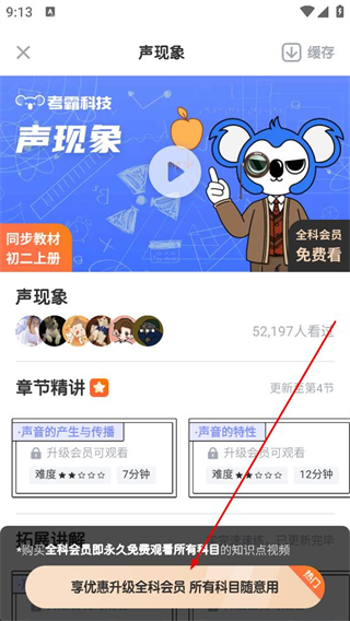 4、進入聲現象學習頁面查看同步教材信息,點擊播放按鈕開始學習,瀏覽章節精講內容,可開通會員觀看完整的講解視頻。
