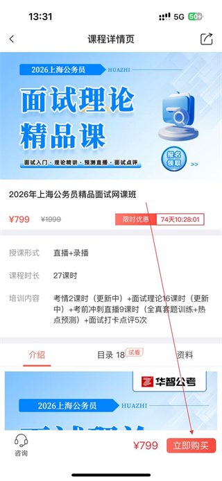 3、在課程詳情頁查看課程價格授課形式等信息,找到頁面下方的立即購買按鈕,也可先了解課程的具體內容。