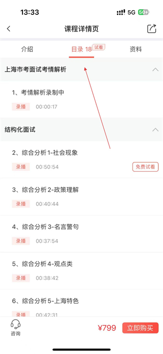 4、切換至目錄標簽頁,查看課程包含的模塊如考情解析結構化面試等,還能選擇部分課程進行免費試看。