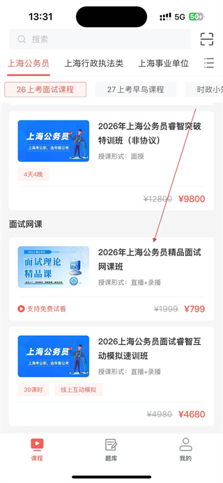 2、登錄后進入課程板塊,瀏覽上海公務員相關課程列表,選擇2026上海公務員精品面試網課班,點擊進入課程詳情頁。