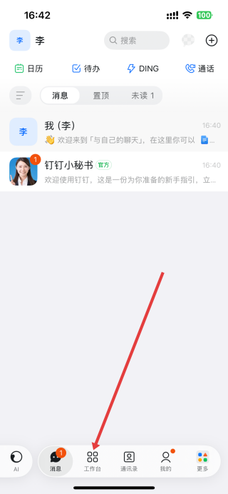 1、打開釘釘,進入消息頁面,能看到與自己的聊天、釘釘小秘書的指引等,點擊工作臺。
