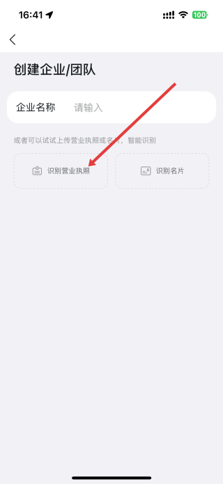 3、進入創建企業、團隊頁面,可輸入企業名稱,也能點擊識別營業執照,上傳相關證件智能識別。