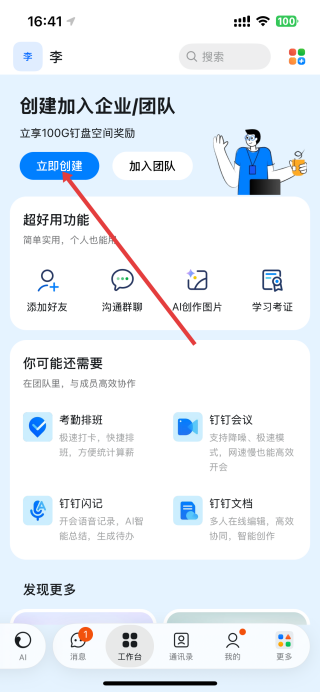 2、進入工作臺頁面,有創建加入企業、團隊等板塊,點擊立即創建,開始創建企業、團隊。