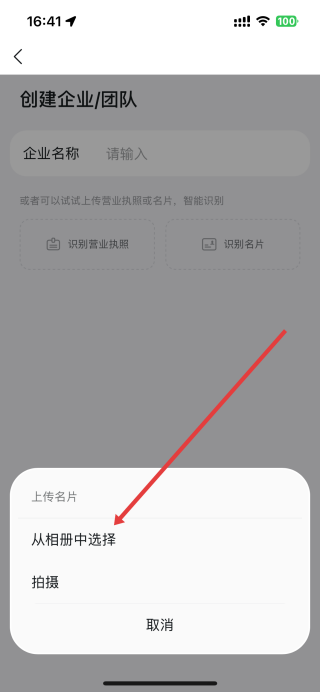 4、點擊識別營業執照后,可選擇從相冊中選擇或拍攝營業執照圖片,完成相關信息上傳,推進企業、團隊創建。