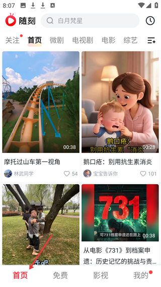 1、首頁有關注、微劇等板塊,展示摩托過山車第一視角、鵝口瘡科普等視頻,可瀏覽各類推薦內容。