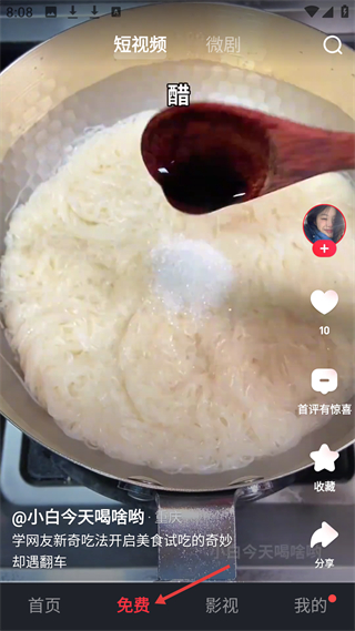 2、免費頁有短視頻、微劇分類,展示美食試吃類短視頻,可點贊、收藏、分享,觀看免費短視頻內容。