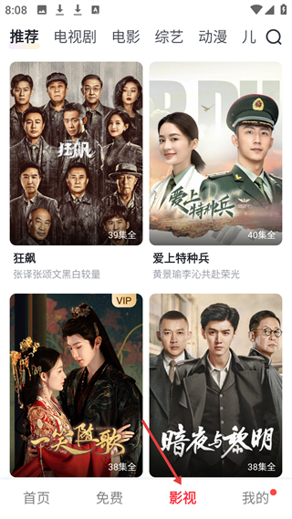 3、影視頁有電視劇、電影等分類,展示狂飆、愛上特種兵等影視作品,可觀看各類影視內容。