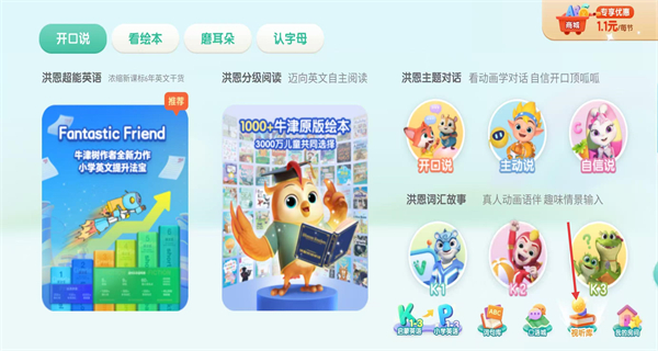 1、首頁,設開口說等功能入口,提供超能英語等課程,含千余牛津原版繪本,按K1-K3分級覆蓋啟蒙到小學英語學習需求。
