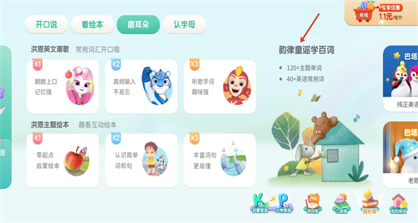 2、磨耳朵頁,含英文潮歌等內容,按K1-K3分級適配不同階段,借韻律童謠教120主題詞,助力兒童詞匯積累。
