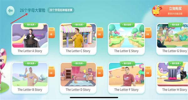 4、字母大冒險頁,以字母故事教學,部分內容限時免費,每故事配少量單詞,幫助孩子鞏固字母發音與詞匯記憶。