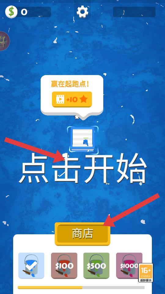 1、進入游戲,看到點擊開始和商店按鈕,可選擇點擊開始直接開啟游戲,也能去商店看看,為游戲做準備。