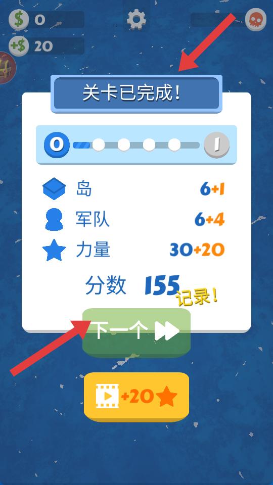 4、成功完成關卡后,會顯示關卡已完成,能看到島,軍隊等相關數據和分數,點擊下一個,就可以繼續挑戰新關卡。