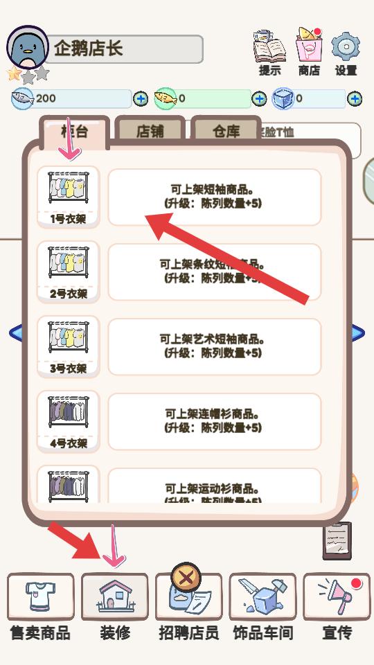 2、在店鋪里,有售賣商品,裝修等功能按鈕,點擊裝修,可對店鋪的衣架等設施進行升級,讓店鋪更完善。