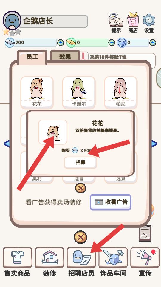 4、點擊招聘店員,可選擇招募不同店員,像花花等,招募后店員能發揮作用,比如提高雙倍售貨收益概率,助力店鋪經營。