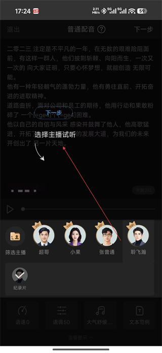 3、進入普通配音頁面查看模板對應的文字內容,選擇主播比如超哥等進行試聽,調整語速語調等參數,適配所需的配音效果。