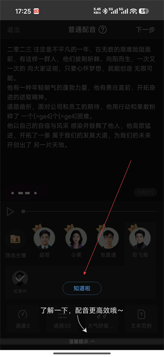 4、在配音編輯頁面查看溫馨提示了解配音技巧,點擊知道啦關閉提示,確認文字內容及主播選擇無誤后,可進行下一步。