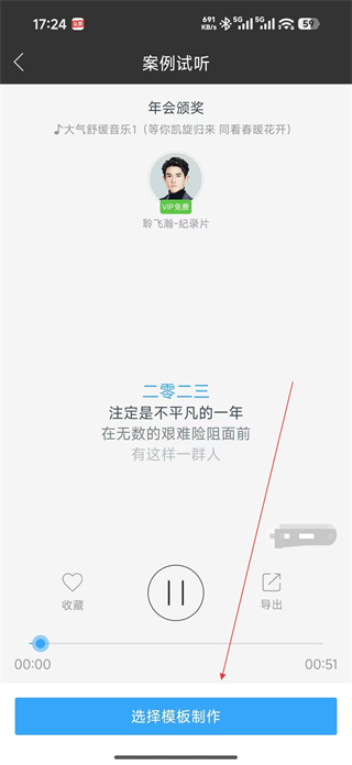 2、在年會頒獎的案例試聽頁面,收聽配音內容,查看對應的文字腳本,點擊選擇模板制作按鈕,進入該模板的配音編輯頁面。