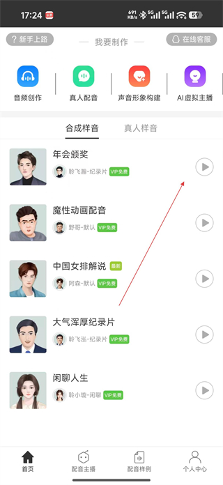 1、進入訊飛配音軟件,瀏覽合成樣音板塊的年會頒獎等案例,選擇年會頒獎樣音點擊播放,試聽該配音的效果,了解對應的配音風格。