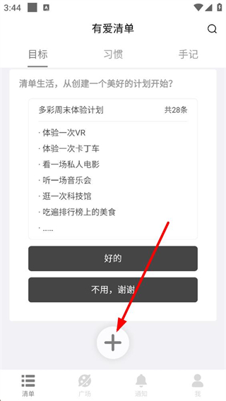 1、進入有愛清單的目標頁面,能看到多彩周末體驗計劃等內容,頁面底部的加號按鈕,是開啟添加新內容的入口,點擊該按鈕即可進入添加目標的操作頁面。