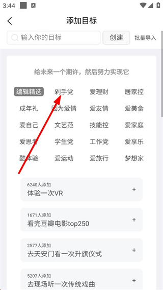 2、點擊加號后進入添加目標頁面,頂部有輸入目標的搜索框和創建按鈕,頁面設有編輯精選剁手黨等分類標簽,還能看到其他用戶添加的各類推薦目標。