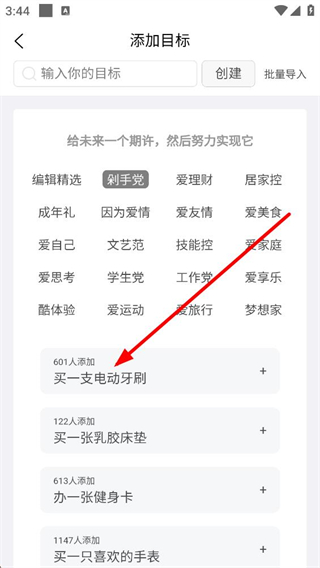 3、添加目標頁面切換到剁手黨分類,可看到買一支電動牙刷等具體目標選項,每個目標右側配有加號按鈕,點擊就能進入該目標的詳情頁面。