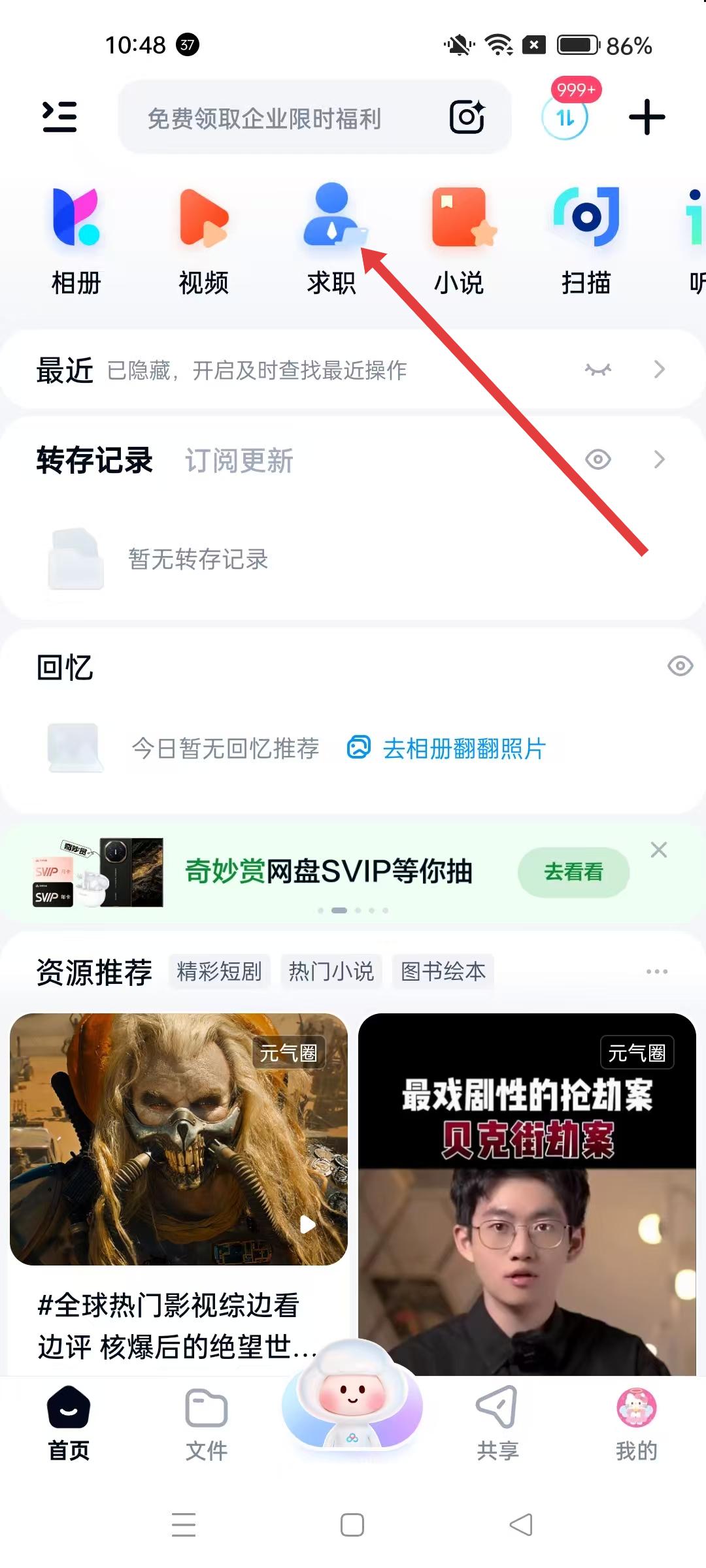 1、打開網盤后,點擊首頁的求職圖標,進入求職助手頁面,開啟AI簡歷生成操作。