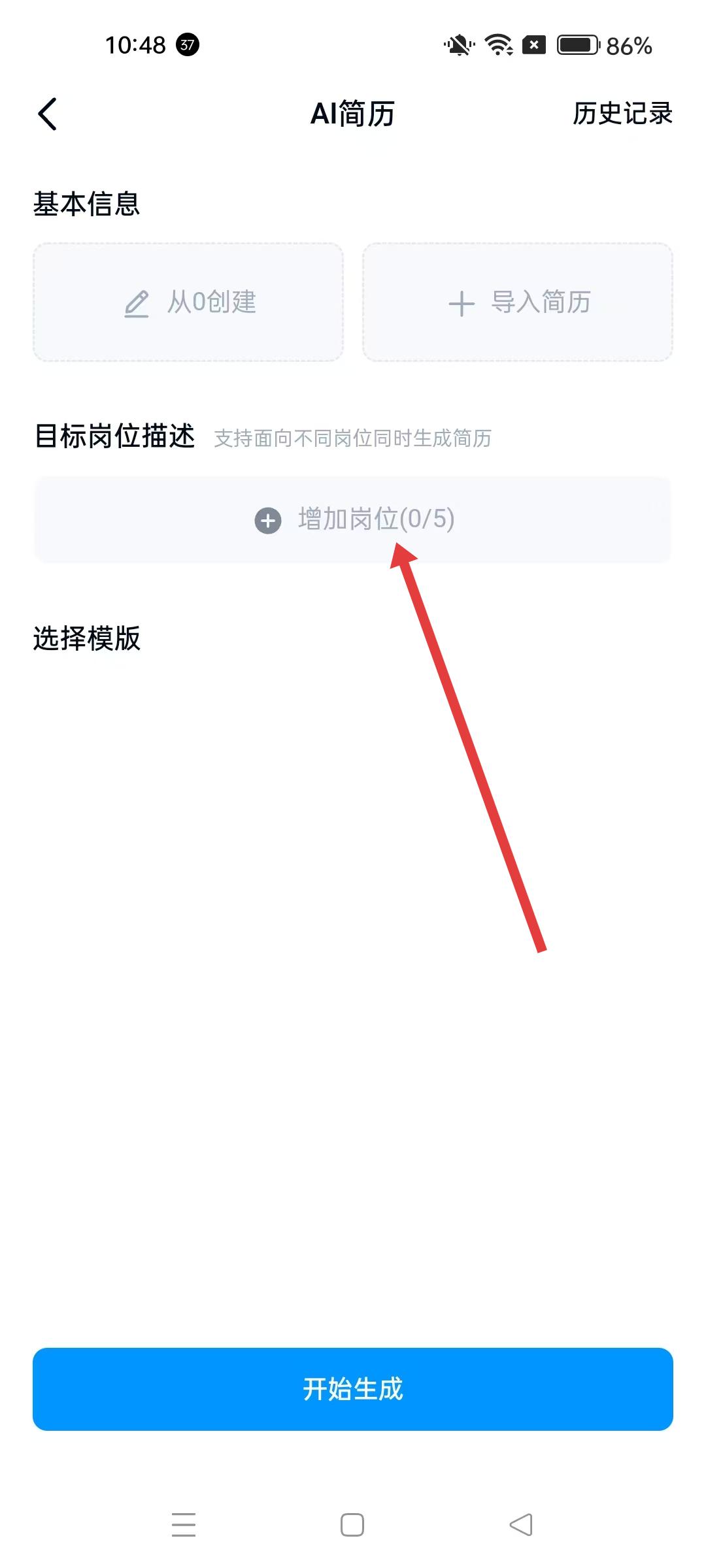 3、AI簡歷頁面,點擊增加崗位選項,進入崗位信息頁面,準備輸入崗位信息。