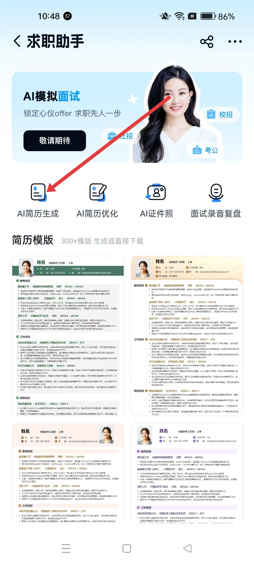 2、求職助手頁面,點擊AI簡歷生成選項,進入AI簡歷頁面,準備添加目標崗位。