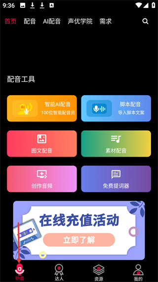 1、首頁聽音板塊,有配音等板塊,配音工具豐富,含智能AI配音等,還有在線充值活動入口,滿足配音創作及服務需求。