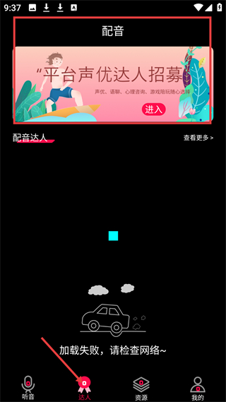 2、達人板塊,有平臺聲優達人招募活動,可選擇聲優、語聊等服務,因網絡問題配音達人內容加載失敗,需檢查網絡后查看。