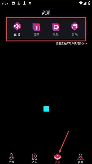 3、資源板塊,提供配音、音效、視頻、音樂資源分類,用戶可查看素材庫使用協議,方便獲取各類音頻視頻創作資源。