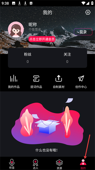 4、我的板塊,可查看昵稱等,有粉絲等數據及作品入口,未登錄時內容為空,登錄后管理創作及賬號信息。