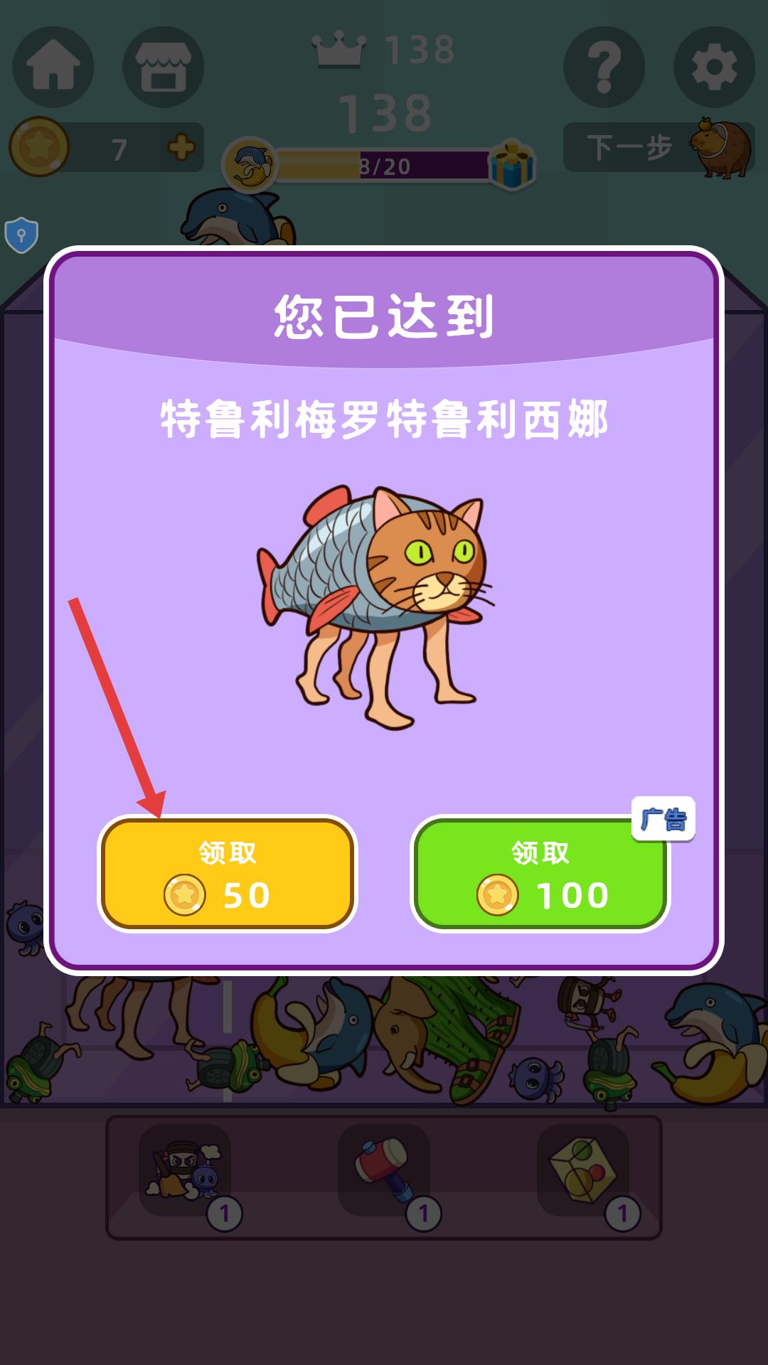 4、當達到一定游戲目標后,會彈出獎勵界面,此時可根據需求,點擊領取50或領取100按鈕,獲取相應金幣獎勵,用于后續游戲。