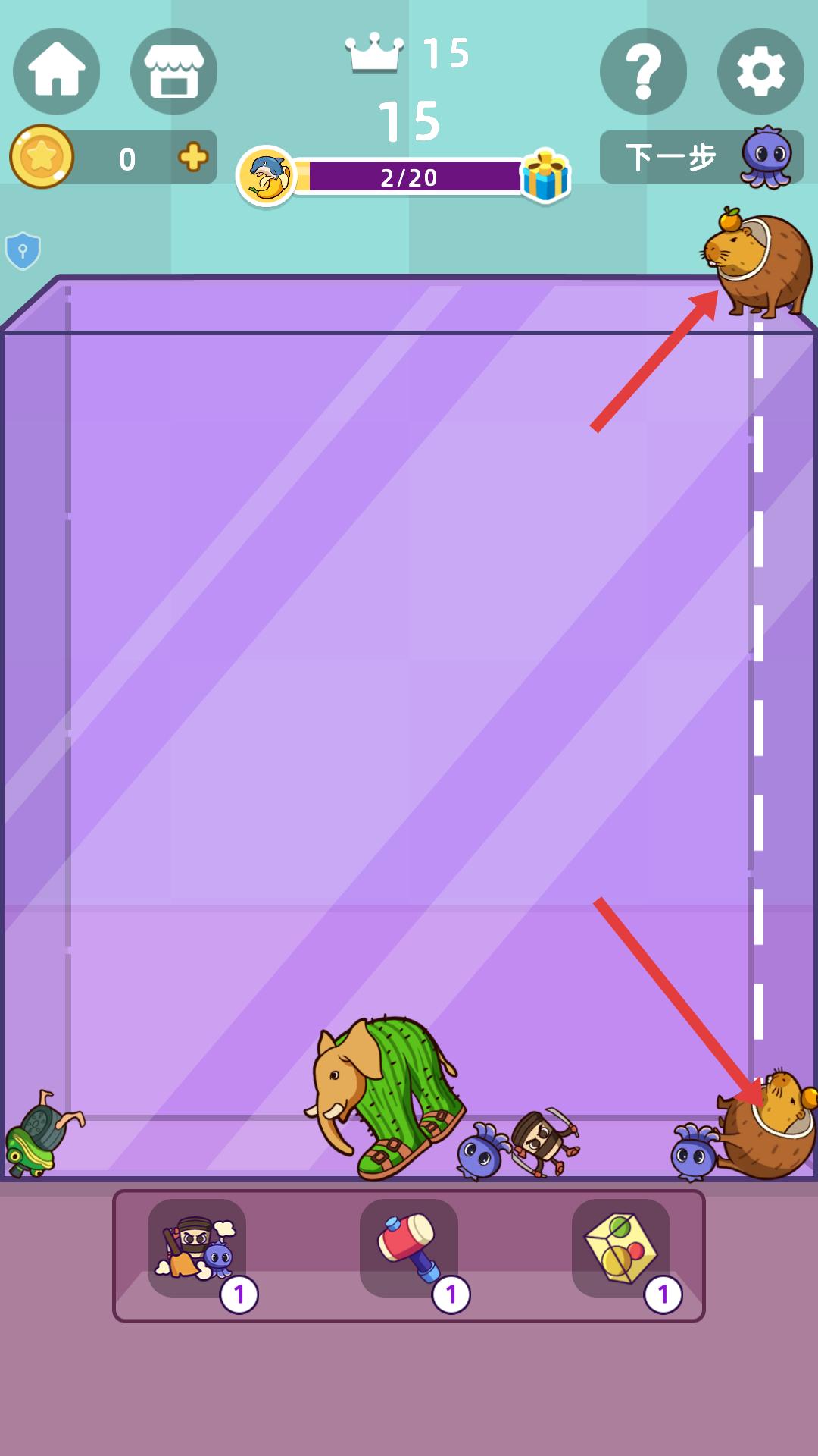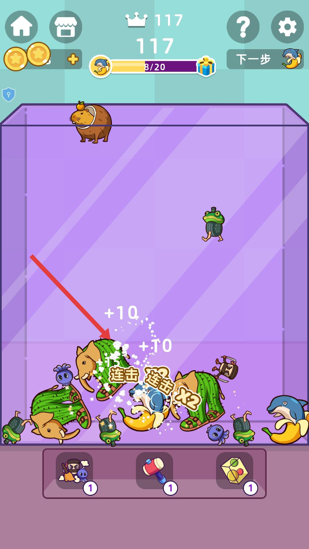 2、隨著游戲進行,容器內會出現大象、海貍等新角色,需觀察它們的位置與移動規律,為后續合成或互動做準備,同時積累分數。