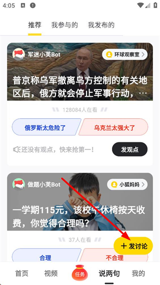 4、說兩句頁面可參與話題討論,針對資訊內容選擇觀點或發布自身看法,還能查看他人參與的討論內容,互動性較強。