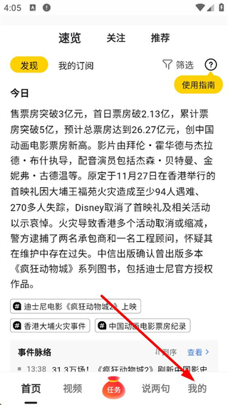 1、資訊速覽平臺首頁可查看各類熱點資訊,包含影視票房、社會事件等內容,還能通過篩選功能精準查找信息,點擊底部我的進入個人中心。