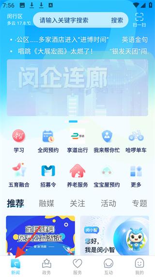 1、新聞界面,顯示天氣,有搜索和掃一掃,有學習、享道出行等服務入口,還有全民健身公益游泳等推薦資訊。