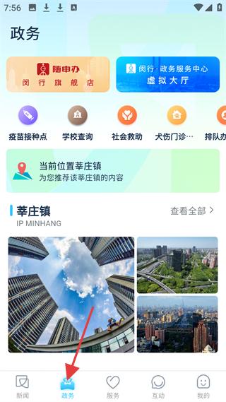 2、點擊底部政務選項進入政務頁面,此頁面有隨申辦閔行旗艦店、閔行政務服務中心虛擬大廳等板塊,還有疫苗接種點、學校查詢等服務,可在此區域查找相關入口。