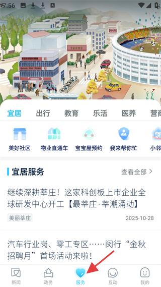 3、點擊底部服務進入服務頁面,上方有宜居、出行等分類標簽,切換到對應生活服務分類,通過分類篩選精準定位,若有口罩預約功能點擊即可進入操作流程。