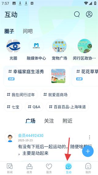 4、互動界面,有圈子、問吧板塊,包含光圈、融媒體中心等圈子,還有幸福家庭生活秀等話題,用戶可在廣場發布互動內容。