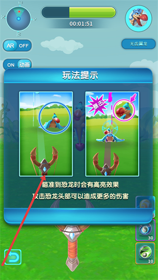 2、瞄準恐龍時會有高亮效果,攻擊恐龍頭部可造成更多傷害,了解玩法提示,提升捕捉恐龍的效率。