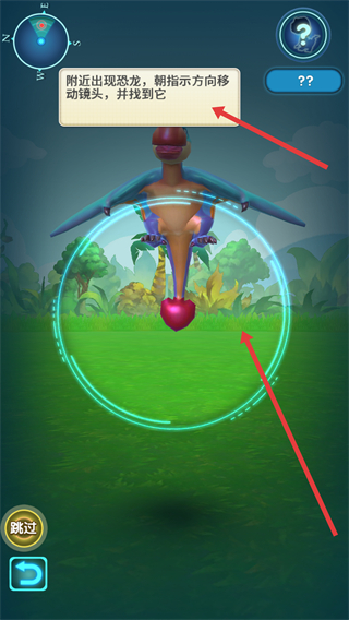 1、附近出現恐龍時,朝指示方向移動鏡頭并找到它,通過尋找恐龍開啟捕龍冒險,體驗捕捉恐龍的樂趣。