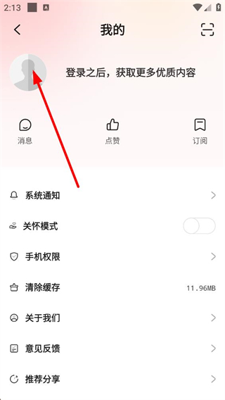 2、點擊頂部個人入口進入我的界面,未登錄時提示登錄可獲取更多內容,含消息、點贊等功能,還有系統通知、關懷模式等設置選項。