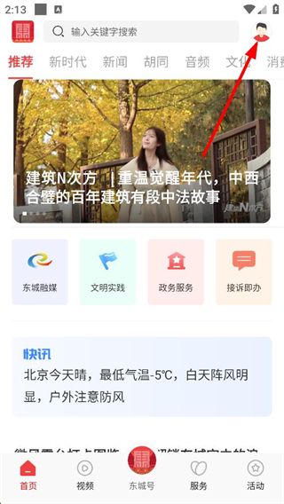 1、進入應用首頁可瀏覽推薦內容,包含建筑文化、天氣資訊等,還有東城融媒、文明實踐等功能入口,底部設首頁、視頻等板塊入口。