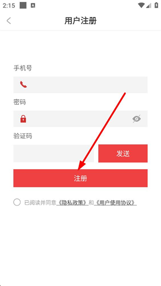 4、進入用戶注冊頁面,需填寫手機號、設置密碼,獲取并填寫驗證碼,勾選協議后點擊注冊按鈕,即可完成賬號注冊操作。