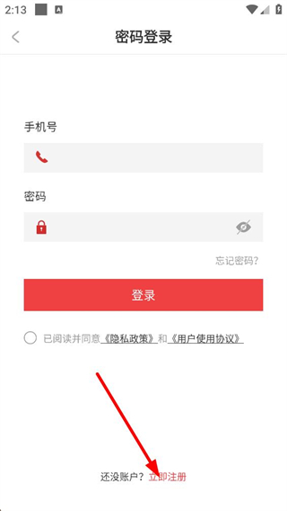 3、選擇密碼登錄方式,需輸入手機號、密碼,勾選協議后點擊登錄,無賬號可選擇立即注冊,還能通過忘記密碼功能找回密碼。