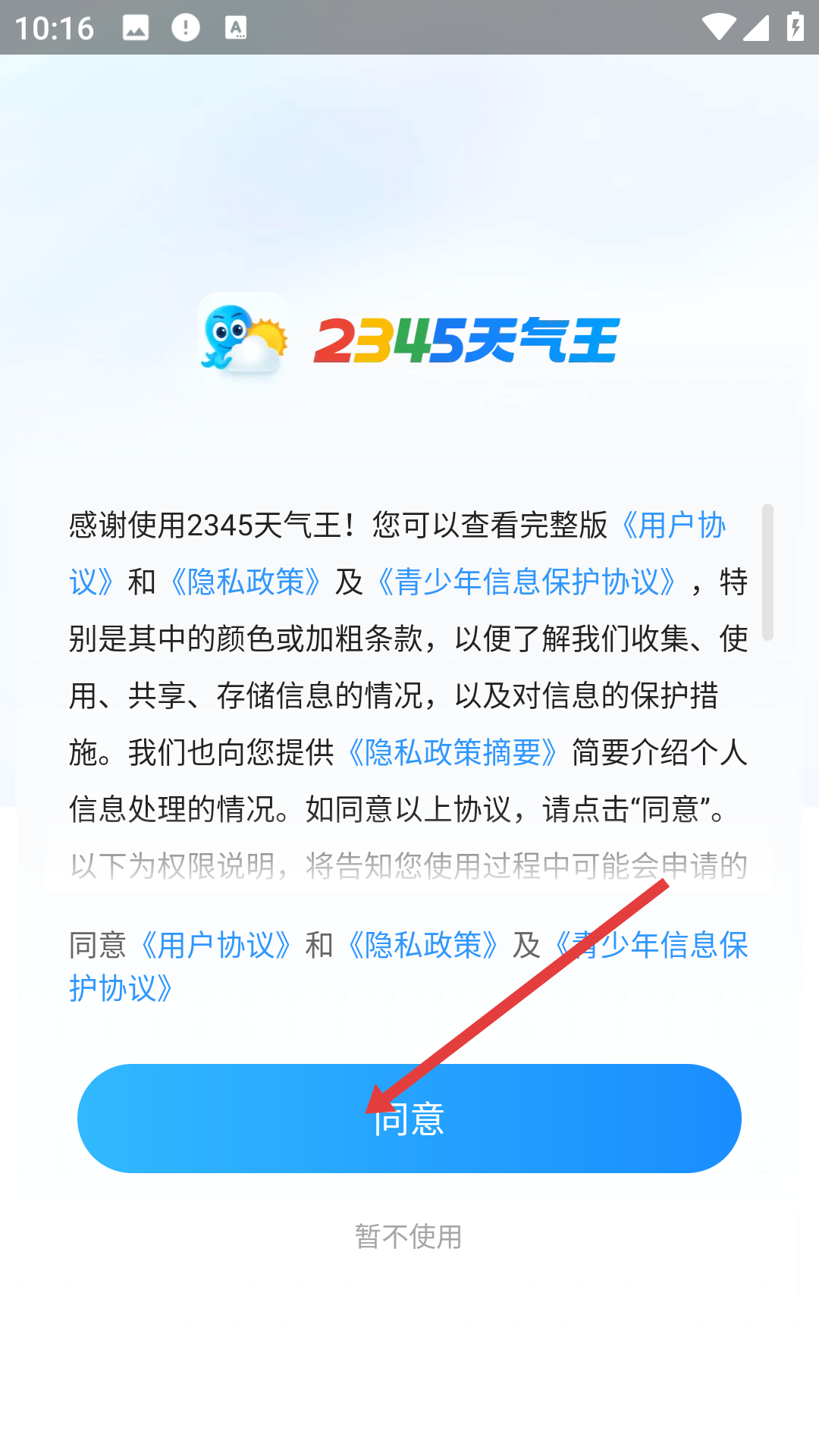 1、首次打開APP會彈出用戶協議及隱私政策界面,需仔細閱讀后點擊同意才能繼續使用APP,這一步是為了確保用戶了解并同意平臺使用個人信息的規則。