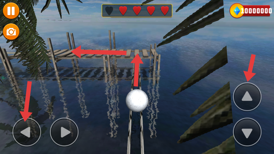 1、操控白色小球在水上木橋前進,右側上下按鈕控制小球前后,左側按鈕控制左右,途中收集綠色寶石,注意保持平衡。